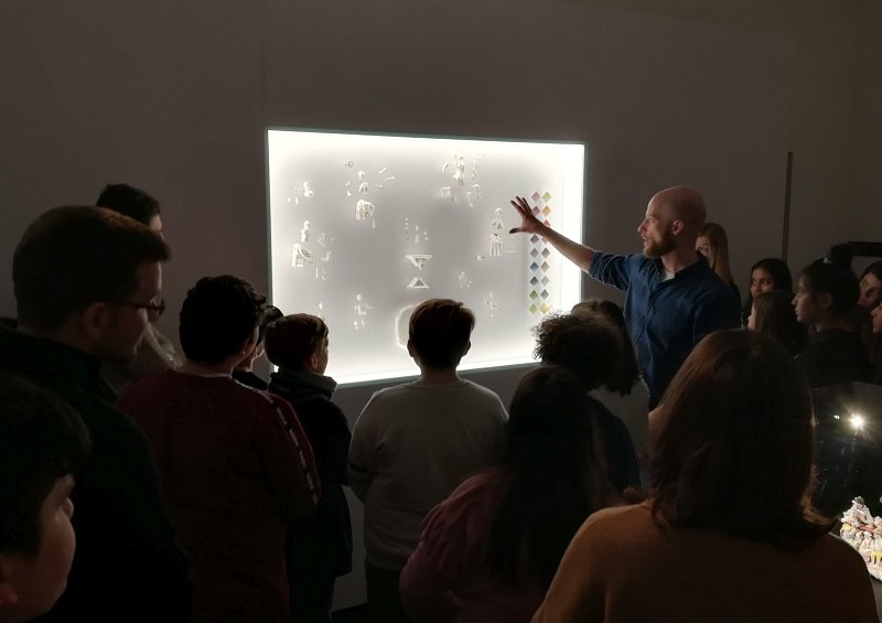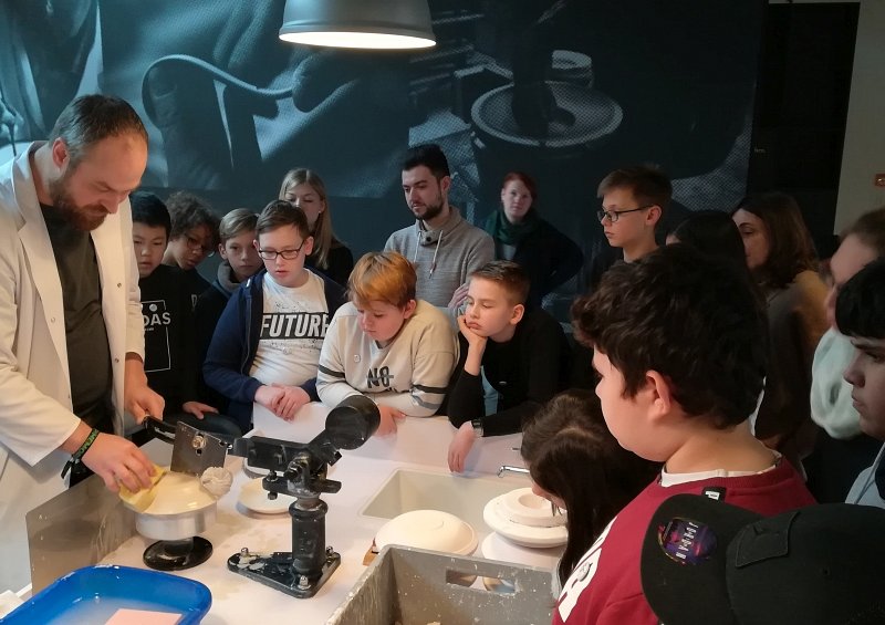 Herr Trentmann stellte zunächst das Porzellanmuseum Schloss Fürstenberg vor und zeigte Teile der Ausstellung des Hauses. „Das wichtigste zuerst“, sagte er: „ihr dürft und sollt hier alles anfassen, außer es befindet sich hinter Glas.“ Ein historisches Museum zu anfassen? Das klingt zwar zunächst ungewöhnlich, sollte sich aber sofort bewahrheiten. Die Scouts lernten zunächst, dass Porzellan aus den Bestandteilen Kaolin, Quarz und Feldspat hergestellt wird. Dafür lagen größere Blöcke der Materialien bereit, die die Schülerinnen und Schüler mit ihren Händen erkunden konnten. Außerdem lernten sie, dass jeder der Stoffe für eine ganz bestimmt Aufgabe innerhalb des Materials Porzellan zuständig ist. Die Schülerinnen und Schüler bekamen Einblicke in die einzelnen und aufwendigen Schritte des Gießens, Brennens und Bemalens. Der Rundgang endete mit dem Highlight der Ausstellung. In einem kleinen dunkeln Raum waren mittig einige weiße Vasen platziert. Vier verschiedene Beamer projizierten gleichzeitig auf die Vasen und „erweckten das Dekore zum leben…“. Damen und Herren einer feinen Gesellschaft tanzten über die bauchigen Vasen und wurden von geometrischen Formen und prunkvollen Mustern abgelöst. Schwalben und Libellen flogen von der einen Vase zur Nächsten. Die Vielseitigkeit des Dekors und die langjährige Kulturgeschichte des Porzellans wurde den KulturScouts hier mittels neuer Medien ganz authentisch vermittelt.
