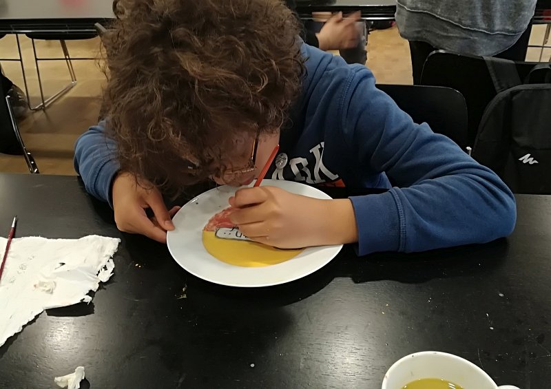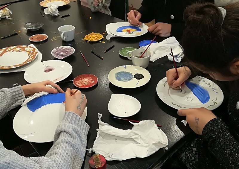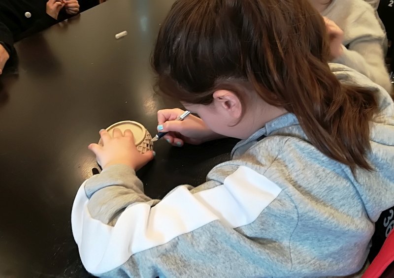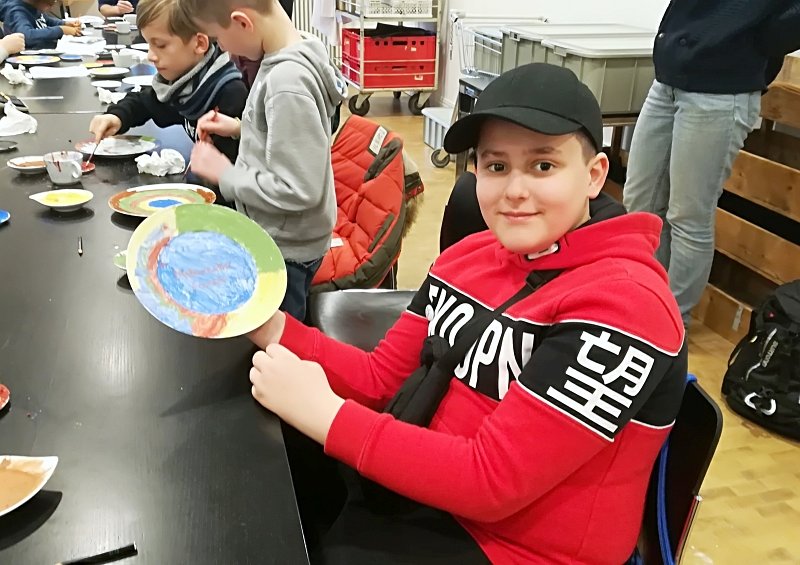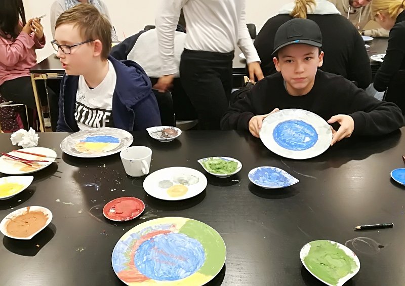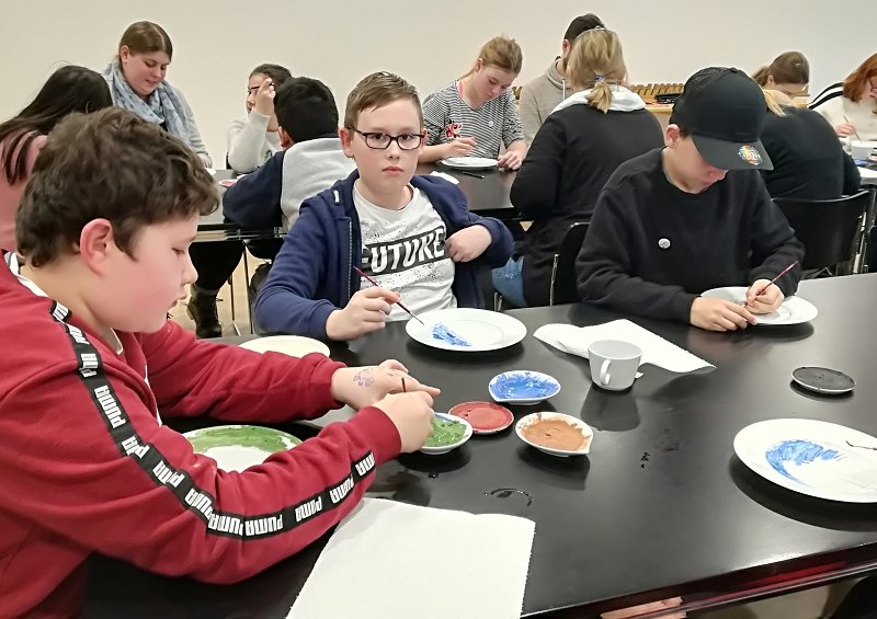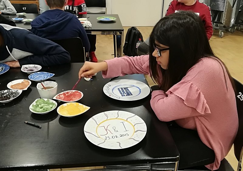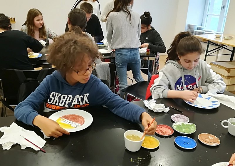 In der letzten Stunde durfte jeder der Scouts einen eigenen Porzellanteller bemalen. Dabei war der Fantasie keine Grenze gesetzt. Jeder durfte malen worauf er Lust hatte und so sind ganz verschiedene bunte und kreative Teller entstanden. Vermutlich auch einige Ostergeschenke, denn das Schloss Fürstenberg brennt im Anschluss die bemalten Teller und schickt sie dann innerhalb von drei Wochen, also in diesem Fall noch vor Ostern, an die Friedrich Wilhelm Murnau-Gesamtschule Bielefeld. Perfekt im Zeitplan wartete der Bus pünktlich vorm Schloss. Nach einem Gruppenbild ging ein spannender und aktiver Tag der Klasse 5c im Museum Schloss Fürstenberg zu Ende.