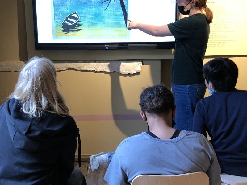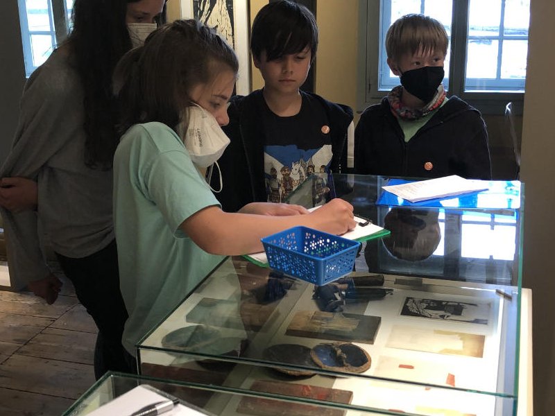 Nachdem wir etwas über Jacob Pins‘ Leben gelernt hatten, durften wir selbst wie der Künstler mit einem Holzbrett als Druckstock drucken.