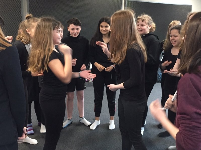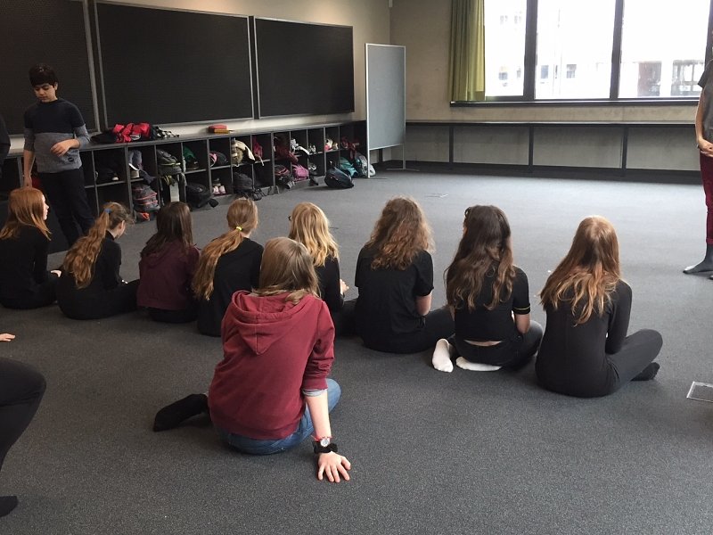 Viele dieser Fragen konnte die Theaterpädagogin in der Woche darauf, bei einem anschließenden Workshop, beantworten. Angefangen mit spaßigen Warm-Ups, die wir immer noch gerne wiederholen, leiteten wir über zur inhaltlichen Auseinandersetzung mit „Hodder“. Eine Sympathieskala der einzelnen Rollen machte noch einmal die verschiedenen Bezüge der handelnden Personen untereinander deutlich. Anschließend erarbeiteten die Schüler in Gruppen Standbilder, in denen sie ihren Standpunkt zu Hodder festlegten.
